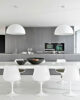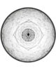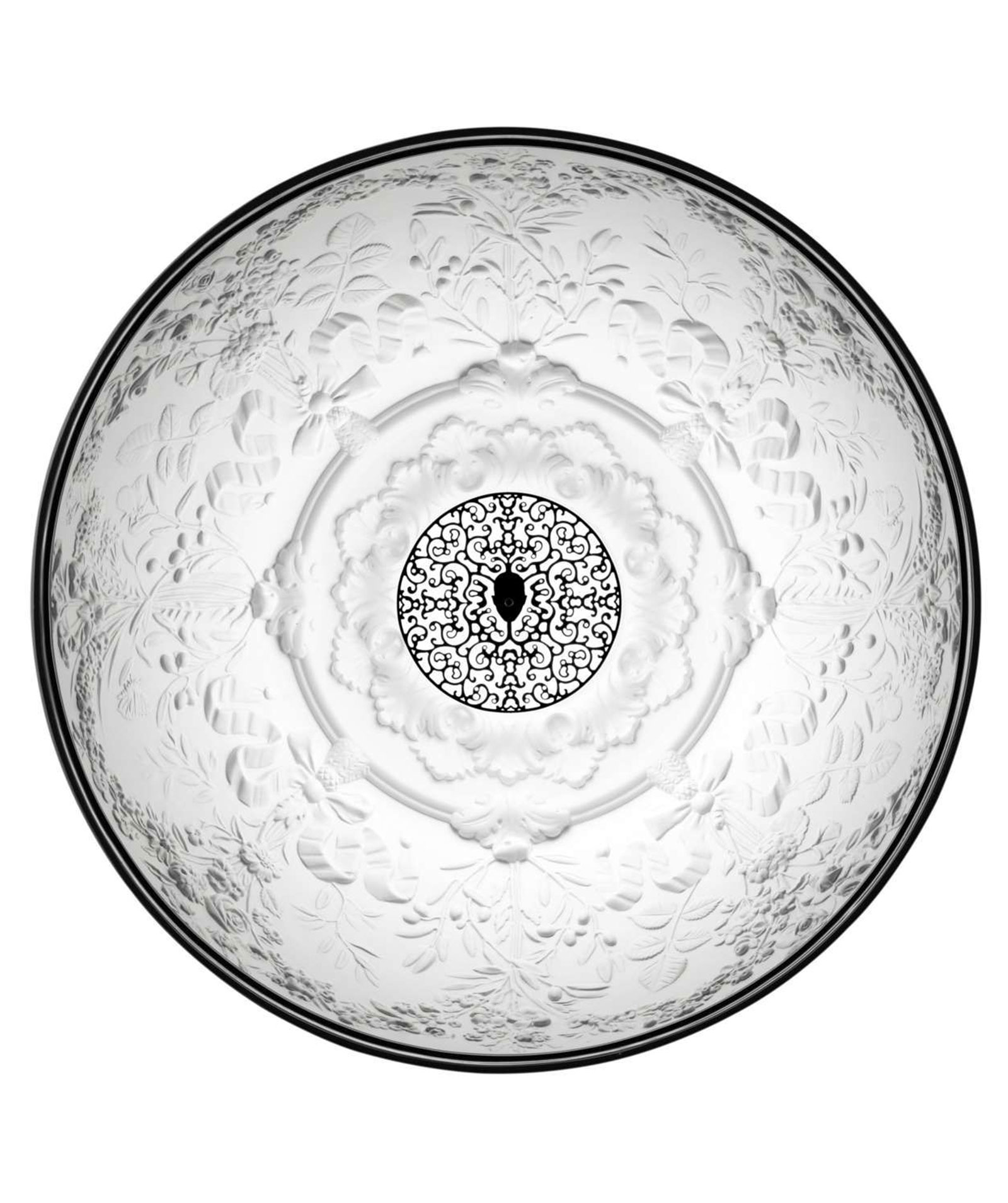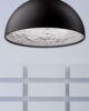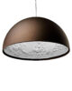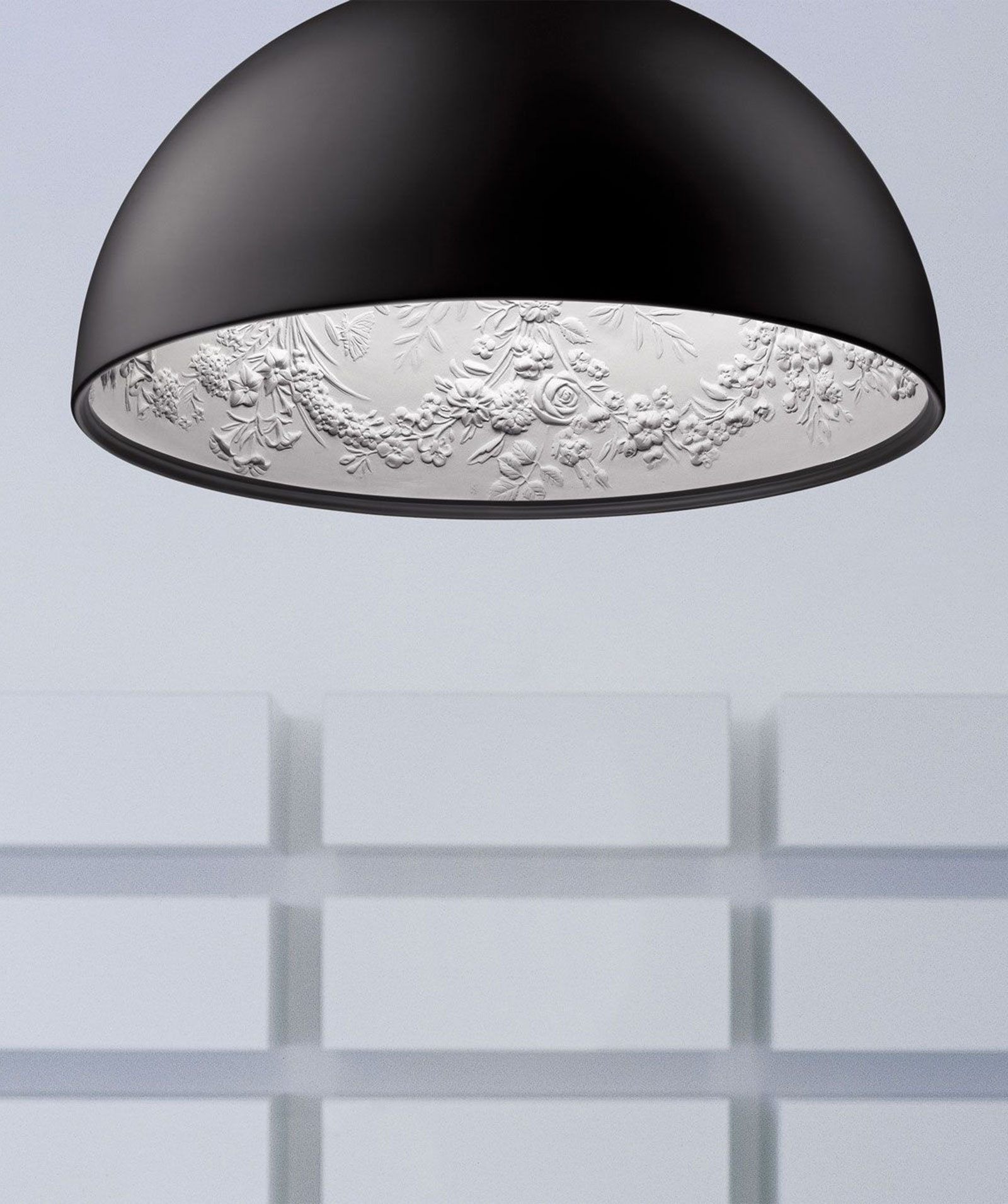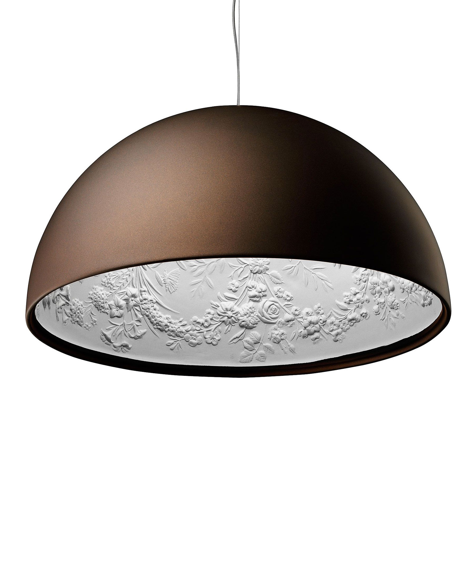 Suspension lamp with diffused light. Dome in cast plaster, mechanically worked and painted white inside, while the chromatic finishes on the outside can be: rust, glossy black, glossy white or matt gold. Ceiling attachment in pressed and galvanized steel. Gray injection-molded PC ceiling rose, painted in the same color as the body. The exterior looks like a dome that internally exhibits floral relief decorations, evoking the appeal of baroque ornamental ceilings on a minimal scale. Produced in two dimensions in diameter, an ironic and nonconformist design by Marcel Wanders.